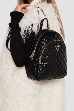 The black women's Giully Flap Backpack by Guess is a stylish and practical accessory made of eco-friendly leather. The backpack closes with a zipper and features a large exterior zippered pocket and protective feet to protect its underside. Inside there is one spacious compartment, a zippered pocket and two slip pockets. A dust bag is included to protect the backpack during storage.