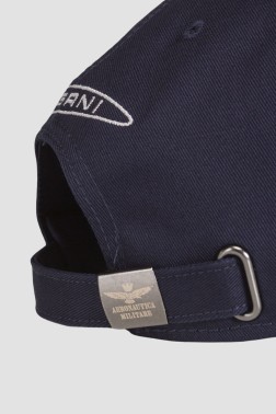 Navy blue baseball cap, by Aeronautica Militare. It is made of 100% cotton. It features an embroidered logo on the front and an adjustable closure on the back.