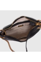 Mała torebka crossbody w kolorze czarnym. Pasek w postaci złotego łańcucha ze skórzanym naramiennikiem. Wewnątrz jedna kieszonka na suwak oraz trzy wsuwane.