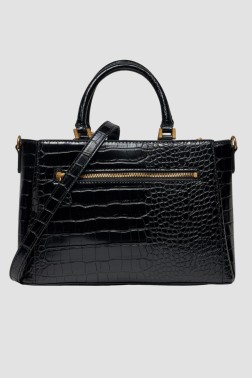 Black G James Logo Girlfriend handbag, by Guess. The handbag is made of organic leather with a crocodile skin texture. Adjustable strap with a length of 105 cm. Inside the handbag there are 3 compartments: 2 sliding, 1 zipped. Inside 3 pockets: 2 slip-in, 1 zipped. On the outside there is 1 zipped pocket. The bag has protective feet. Dust bag included.