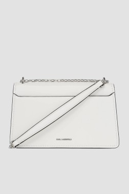 White K/iconic 2.0 Leather handbag by Karl Lagerfeld. The handbag is made of natural leather and has a 112 cm long strap. The height of the handles is 25,5 cm. The flap closes with a snap closure, inside there are two slip pockets. On the outside, an additional slip pocket.