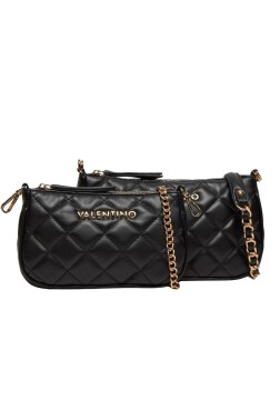 Ocarina Crossbody double black handbag by Valentino by Mario Valentino. The handbag has a zippered closure. Inside there is one zipped pocket and one slip pocket, as well as a small pouch measuring 12 cm high, 19 cm wide and 4 cm long. Inside the pouch there is one zippered and one slip pocket, and two attachable chains one 119 cm long and the other 59 cm long. A dust bag is included.