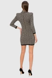 Ivory-colored knit dress with black Balmain monogram. Dress with a stand-up collar, with shoulder pads. Fastened with a gold zipper on the back. Long sleeves and hem finished with black ribbing.
