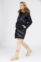- Side zippers, hood with detachable raccoon fur, covered drawstring waistband