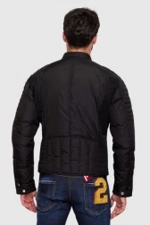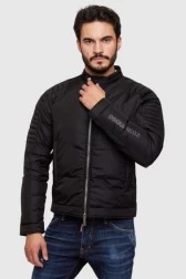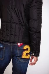 DSQUARED2 men's down jacket in black with a stand-up collar. The jacket features stitching on the shoulders and a slight fit at the waist. Printed on the left sleeve with a black logo. Fastened with a two-way zipper. Cuffs fastened with press studs. Two zippered pockets on the front. Inside, one snap pocket.
