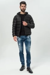 EA7 EMPORIO ARMANI down jacket with hood in black. Fastened with a two-way zipper. Logo patch on the left shoulder. Two zippered pockets on the front. Inside an additional two pockets. The jacket is finished with a narrow ribbed elastic band at the waist, at the cuffs and along the hood.