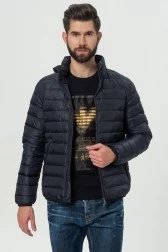 Puchowa, pikowana kurtka męska EA7 EMPORIO ARMANI w kolorze granatowym. W stójce, pod krytym zamkiem, zwinięty cienki kaptur. Kurtka zapinana na dwubiegunowy suwak. Na lewym ramieniu naszywka ze srebrnym logo. Z przodu dwie kieszenie na zamek. Wewnątrz dodatkowa kieszeń na zamek. Kurtka wykończona wąskim ściągaczem z gumy w pasie i przy mankietach.