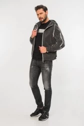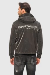 EMPORIO ARMANI men's jacket in gray color. White logo on the back and a decorative zipper on the left sleeve. The jacket is made of ultra-lightweight, waterproof and windproof Extra Shiny Glass technical fabric. White zipper closure. Hood with visor, drawn with ties with metal stops. Two snap pockets on the sides. Inside, two zippered pockets and detachable suspenders. Drawstrings at the cuffs with snaps. Adjustable elastic band at the waist.