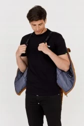 Brown jacket with bipolar zipper, thermoregulation, suspenders and hood.