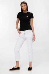DSQUARED2 women's cropped jeans in white, decorated with rubbed details. On the front at the fastening the brand's characteristic red logo label. Fastened with buttons. Two slip pockets on the front and back.