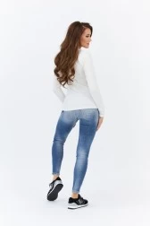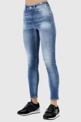 GUESS women's jeans in blue color with rubbing. Fitted cut, high rise, narrow legs. Zip and button closure. Three on the front, two slip pockets on the back. Triangle logo applique on back right pocket.