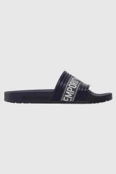 Men's navy blue flip-flops with logo embroidered on the material.