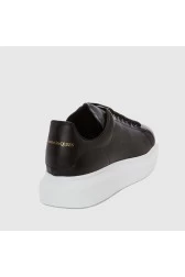 Men's Alexander McQueen calf leather sneakers in black. Gold logo on the tongue and heel counter.