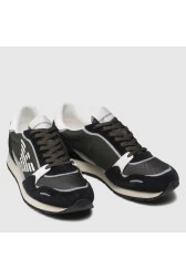 EMPORIO ARMANI men's sneakers in khaki color. Upper with suede and leather elements in navy, white and gray and decorated with reflective piping. White logo on the side. On the tongue the company name, on the heel the logo. Sole in ecru and black.