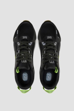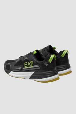 Black men's sneakers with green logo, by EA7 Emporio Armani.