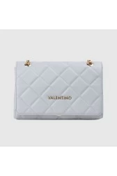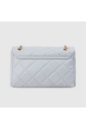 Quilted satchel in gray color. Strap in the form of a gold-colored chain with gray epaulettes. Flap with snap closure, zippered compartment. Inside one zipper pocket and a compartment.