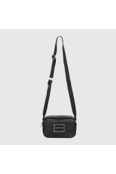 Embossed black handbag with logo and attachable pouch. It closes with a zipper. Inside there is one zipper pocket and one small compartment.