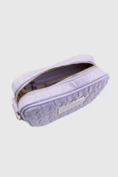 Embossed handbag with logo and attachable pouch in purple. It closes with a zipper. Inside there is one zipper pocket and one small compartment.