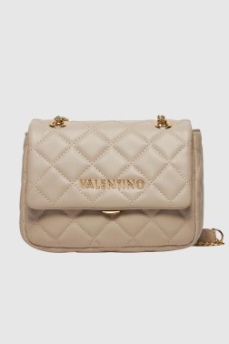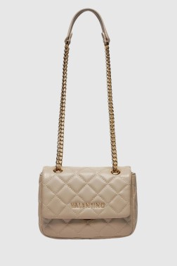 Stylish small quilted Ocarina handbag, by Valentino by Mario Valentino, on a gold chain. The flap closes with a snap closure, inside one slip pocket and one zipped pocket. It can be carried in hand (handles height 33 cm) or on shoulder (58 cm) with low handle (7 cm). Dust bag included.
