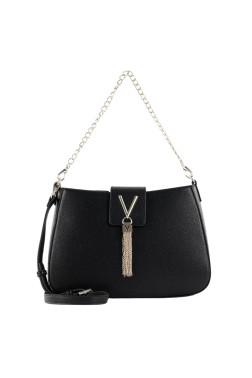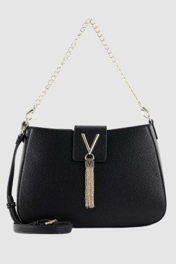 Divina postbag by Valentino by Mario Valentino. The bag closes with a magnet. Inside, one zipped pocket and two slip pockets. It has two attachable straps: a 45 cm chain and a 115 cm adjustable strap.