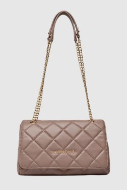 Women's Ocarina medium handbag by Valentino by Mario Valentino. The flap closes with a snap closure, the interior with a zipper. Inside, one slip pocket and one zippered pocket. It has a gold chain that can be worn on the shoulder (height 58 cm) with a small handle (8 cm) or in hand (32 cm). A dust bag is included.