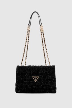 Black fabric Giully 2 handbag by Guess with a blend of wool. The handbag closes with two magnets. Inside there are two compartments, a zippered pocket and six card slots. The bottom of the handbag is protected by feet. On the back of the bag an additional zippered pocket. Dust bag included.