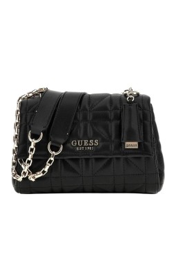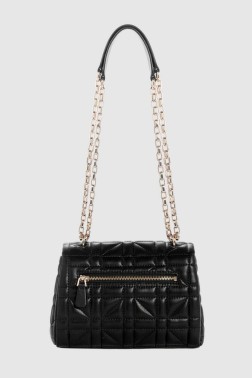 Black Assia mailbag by Guess. The flap of the bag closes with two magnets, with an additional zippered pocket on the back. Inside, the handbag has three compartments, six card slots and one zippered pocket. Dust bag included.