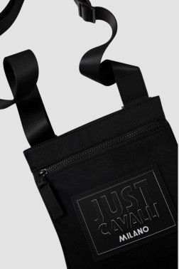Black men's Range Institutional Logo bag by Just Cavalli. Zippered, it features an additional zippered pocket on the outside. Inside, there is one zippered pocket and two slip pockets. The bag has adjustable straps and a dust bag.