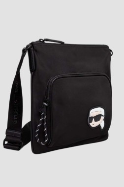 Black men's K/Ikonik 2.0 Nylon Flat CB bag by Karl Lagerfeld. It has one compartment and one slip pocket inside, as well as an additional slip pocket on the outside. The bag closes with a zipper and comes with an adjustable strap.