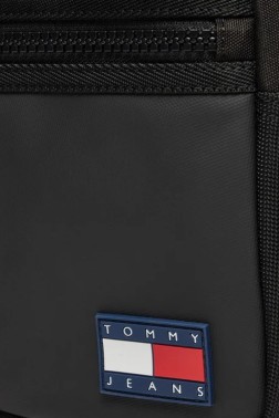 Black men's pouch by Tommy Hilfiger made of eco-friendly leather. Zippered, it features 1 compartment and 1 zippered pocket inside. Equipped with an adjustable strap, it offers practicality and comfort for everyday use.