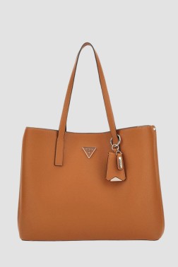 Brown shopper bag "Meridian Girlfriend Tote" by Guess. The capacious handbag is made of ecological leather. Inside there are three compartments: two with a magnet and one with a zipper; three pockets: two slip and one with a zipper. The height of the handles is 22 cm. The bottom of the bag is protected by protective feet. Included is a branded dust bag.