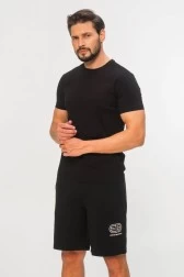 EMPORIO ARMANI cotton shorts in black. Embroidered logo on the left leg in white. Two slip pockets on the sides, two on the back. Waistband on elastic, additionally drawn with a hidden drawstring.