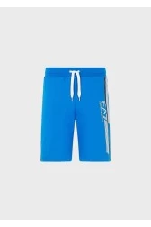 Men's cotton sports shorts in blue by EA7 Emporio Armani. Decorated on the left leg with stripes and logo in white and black. Drawstring waistband with trousers in white. Two slip pockets.