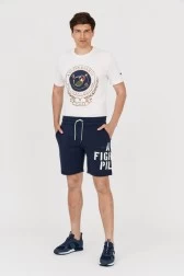 Navy blue men's sweat shorts with embroidered logo and AM Fighter Pilot print.