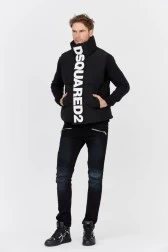 DSQUARED2 men's down sleeveless jacket in black. Featuring a large white logo along the closure. Fastened with a two-way zipper and Velcro closure. Two snap pockets on the front. Inside, one snap pocket.