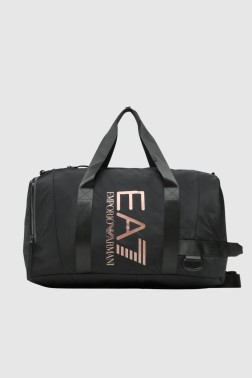 Black sports bag with rose gold logo. Features handles and a attachable adjustable strap. Large zippered pocket on the side. Capacious zippered compartment. One zippered pocket inside.