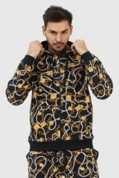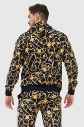 Unbuttoned men's MOSCHINO UNDERWEAR sweatshirt in black with hood. Sweatshirt in gold chains with teddy bears and strings of pearls. Two slip pockets on the front. The hood is pulled down with straps. Bottom and sleeves finished with ribbed hem.