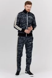 PALM ANGELS unbuttoned men's sweatshirt in black with gray moro. On the sleeves there are beige stripes. On the front the logo in white. The sweatshirt is fastened with a white zipper.Two zipper pockets onthe front.Bottom and sleeves finished with a ribbed hem.