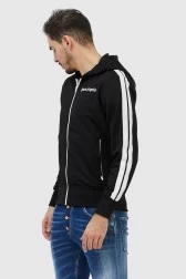 PALM ANGELS unbuttoned men's sweatshirt in black with hood. On the front the logo in white. On the sleeves white piping. The sweatshirt is fastened with a white zipper.Two zipper pockets onthe front.Bottom and sleeves finished with a ribbed hem.