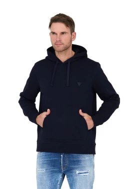 Navy blue men's hooded sweatshirt, tucked in over the head, by GUESS.