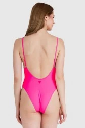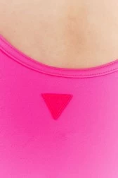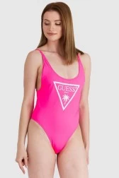 GUESS one-piece swimsuit in neon pink. Printed on the front with a triangular logo. Small logo applique on the back. Adjustable straps.