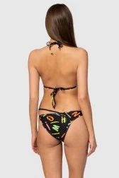 Black MOSCHINO SWIM bikini bottom in neon letters and logos in yellow, pink, blue and green. Decorative ribbon at front to back.