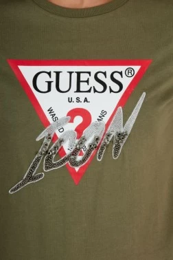 GUESS ICON women's t-shirt in olive green. Beaded triangular logo on the front.