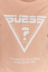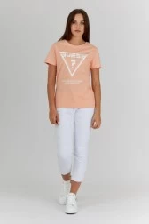GUESS women's T-shirt in peach color. White print with triangular logo on the front.