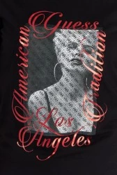 GUESS women's t-shirt in black. Large print with a model on the front. Turn-up sleeves.