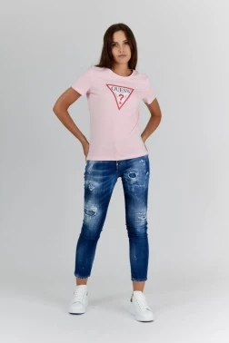 GUESS women's T-shirt in light pink. Printed on the front with a triangular logo.
