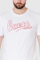 GUESS men's t-shirt in white. Red beachwear logo on the front.