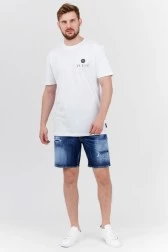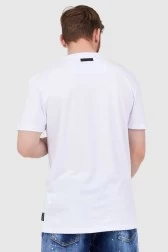 Men's t-shirt in white color. Decorated with a metal logo. On the back little logo on a leather tag. The t-shirt has a round, ribbed neckline.