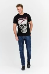 Men's t-shirt in black color. Decorated with a large skull appliqué made of rhinestones in silver, black and red. Metal logo on the back in silver color. The T-shirt has a round, ribbed neckline.
