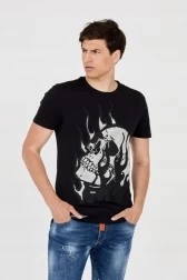 Men's black t-shirt with a flame skull embellished with rhinestones.